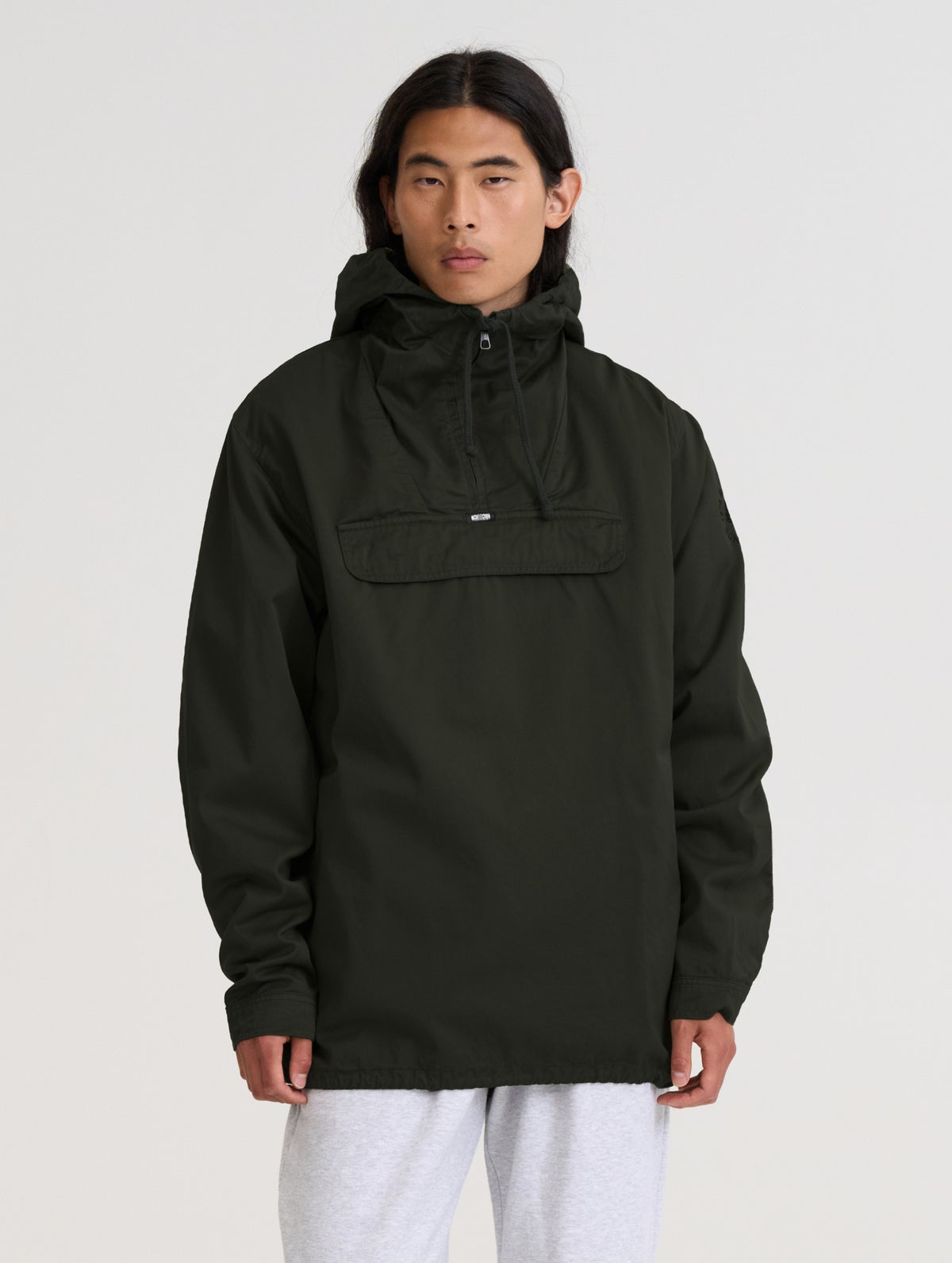 The anorak, a classic basic design. Made from durable and strong GOTS certified 100% organic cotton fabric. Loose fit, suitable for both men and women. Perfect for outside activities all year round. Large chest pocket on the front and zip pockets on the sides. Drawstrings in the hem and hood. An embroidered logo on the left side sleeve.