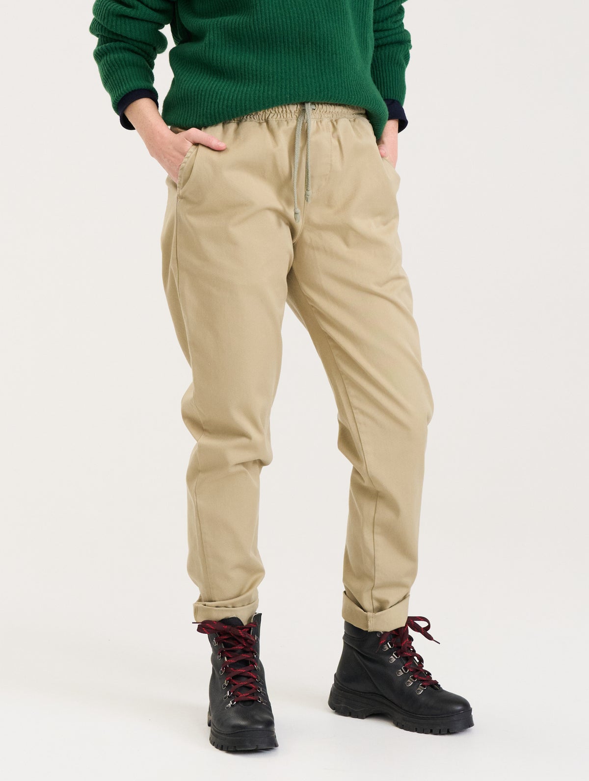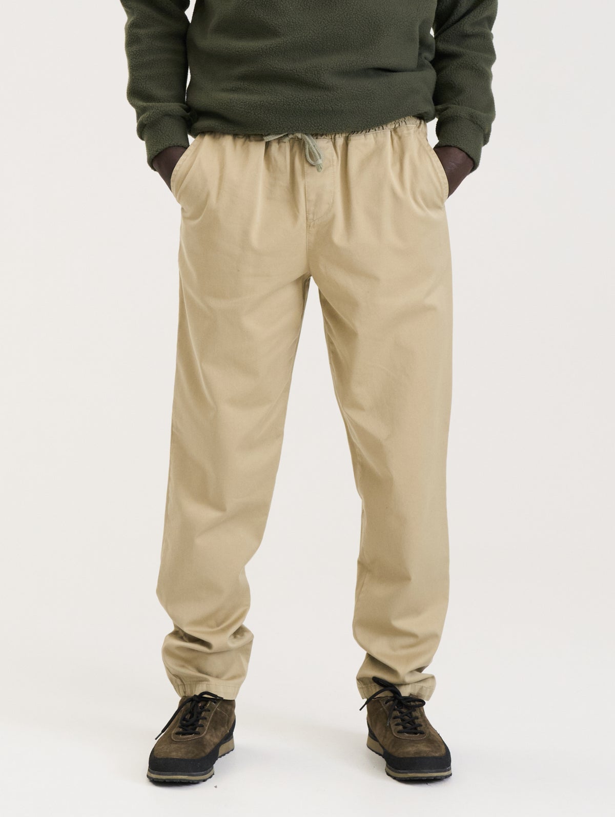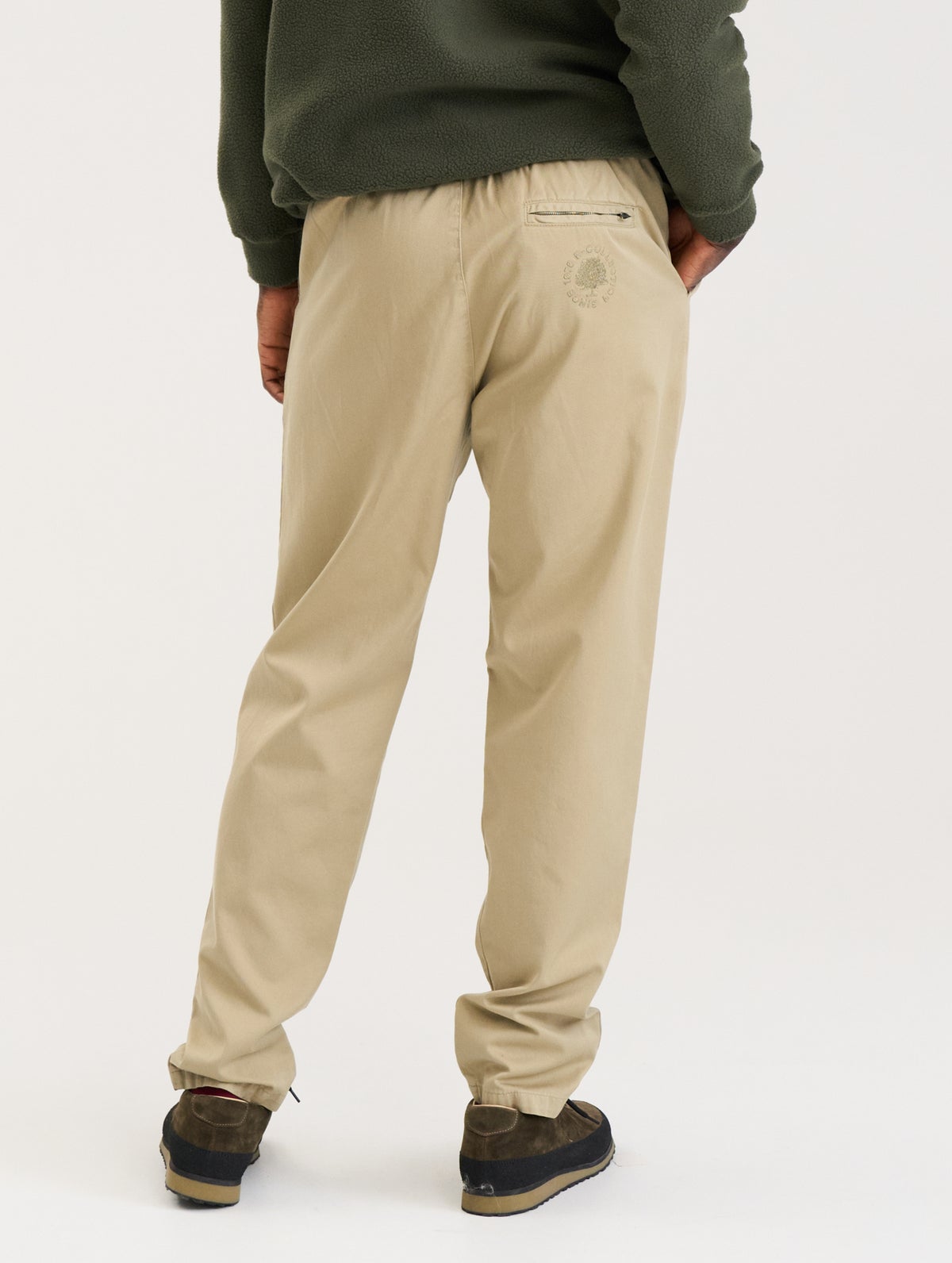 Anorak trousers with a straight-cut leg. Made from durable and strong GOTS certified 100% organic cotton fabric. Elastic waistband with drawstring. Side pockets and one zippered back pocket with an embroidered logo on it. Unisex design.