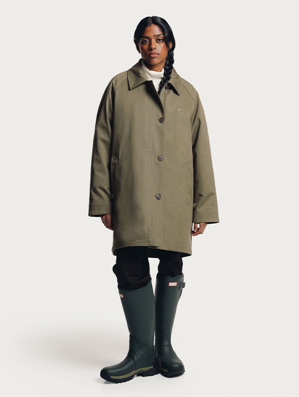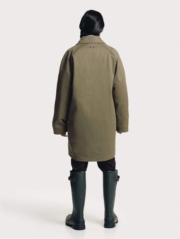 Women's midlength 3-in-1 jacket for between seasons and winter. Outer jacket has no lining and it's made of organic cotton. Two-way zipper on the front with wind panel and press buttons. Raglan sleeves and an embroidered tree logo on the front.