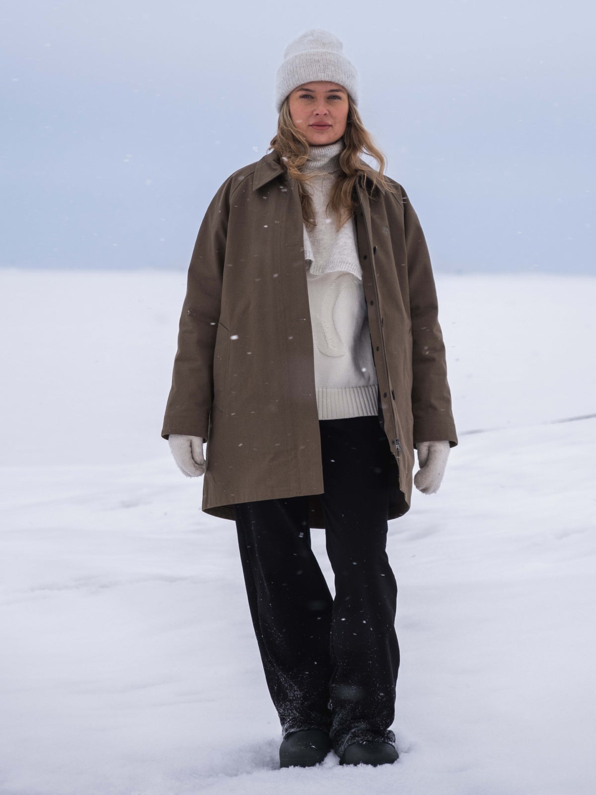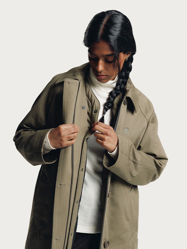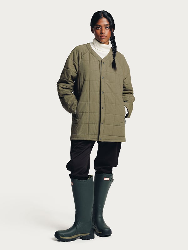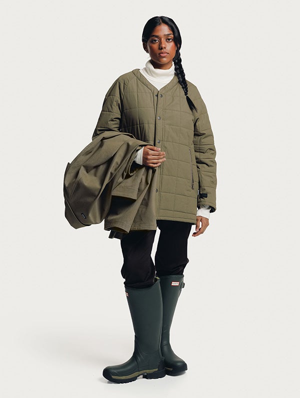 The quilted inner jacket has light padding. V-neck and press buttons on the front. Slanted pockets with zippers. Inner jacket can be attached with the press buttons on the front and there's press buttons with loops on the sleeve-ends and in the back of the neck. The surface material of the inner jacket is organic cotton.
