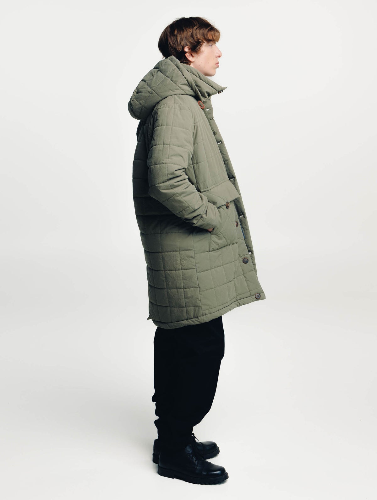 Checkered mid-length quilted jacket with unisex fit. The hem is longer on the back and there is a slit. Stand-up collar and detachable hood. Zipper and button panel on the front. Patch pocket has a double structure, it has a buttoned flap pocket and slanted handwarmer pocket which is open from the side.