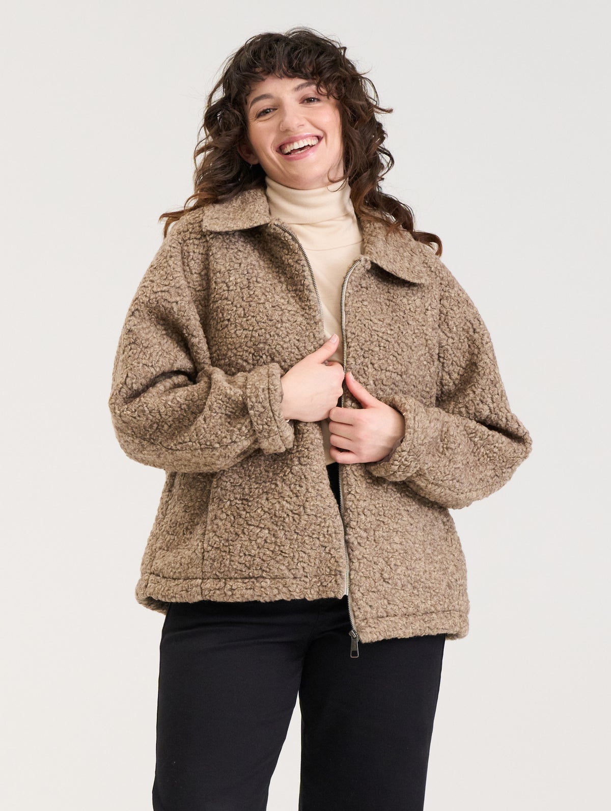 Women's light teddy jacket for between seasons. Simple, relaxed fit. Straight sleeves without shoulder seam. Zipper and pockets on the front.