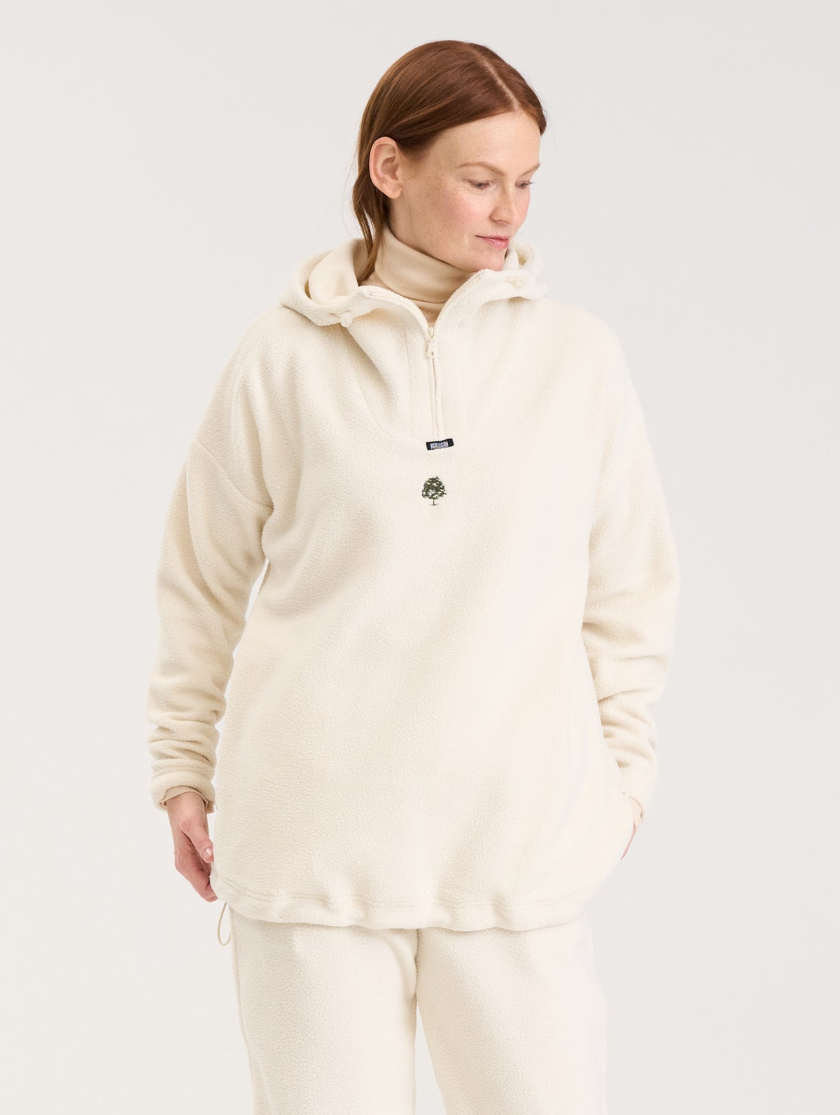 Loose unisex fit fleece hoodie. Zipper on the collar and elastic band adjustment on the hood and the hem. Side pockets with zippers and an embroidered tree on the front.