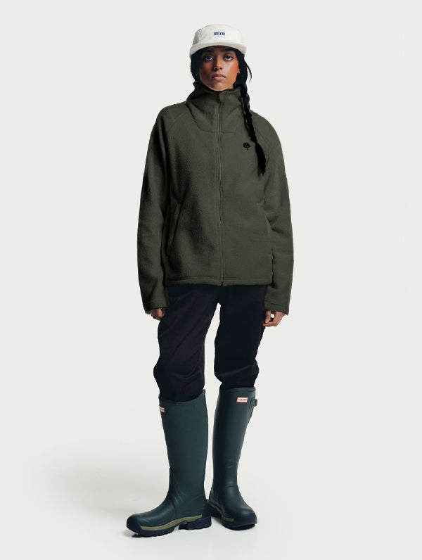 Soft unisex fleece jacket. Raglan sleeves, high collar, and zipper on the front. Slanted pockets with zippers. Embroidered tree logo on chest. The hem is longer at the back and there are gentle slits on the sides.
