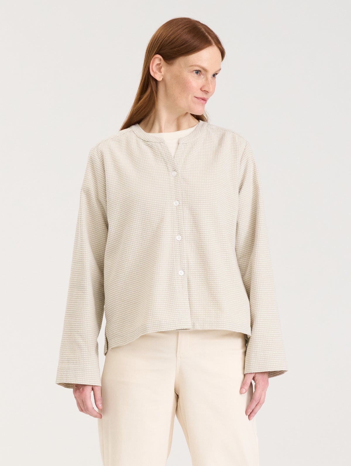 Women's shirt with buttons on the front. Fitted, slightly downwards widening sleeves. Back yoke and plates on the back.