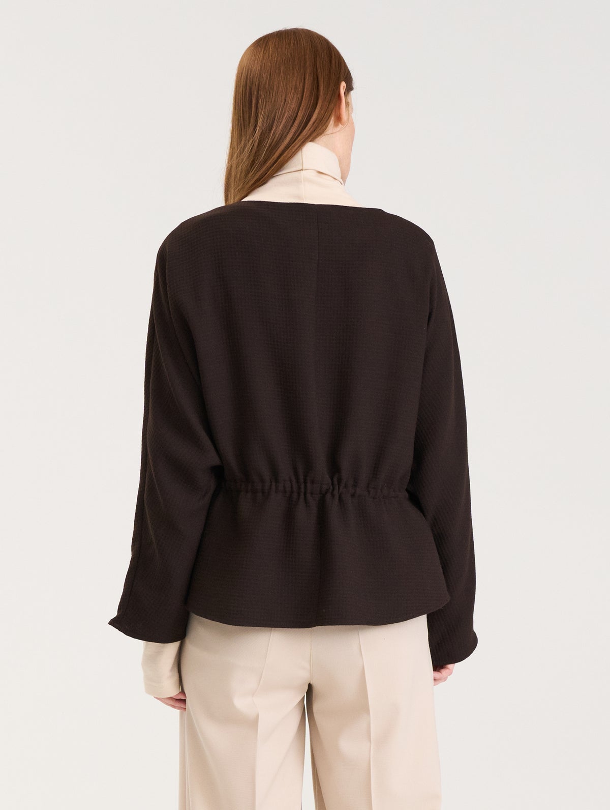 Women's kimono-sleeved blouse. Vertical seam at the front. The waist is adjustable with a drawstring. The hem is slightly longer at the back. The waffle fabric has three-dimensional checkered and cellular surface structure.