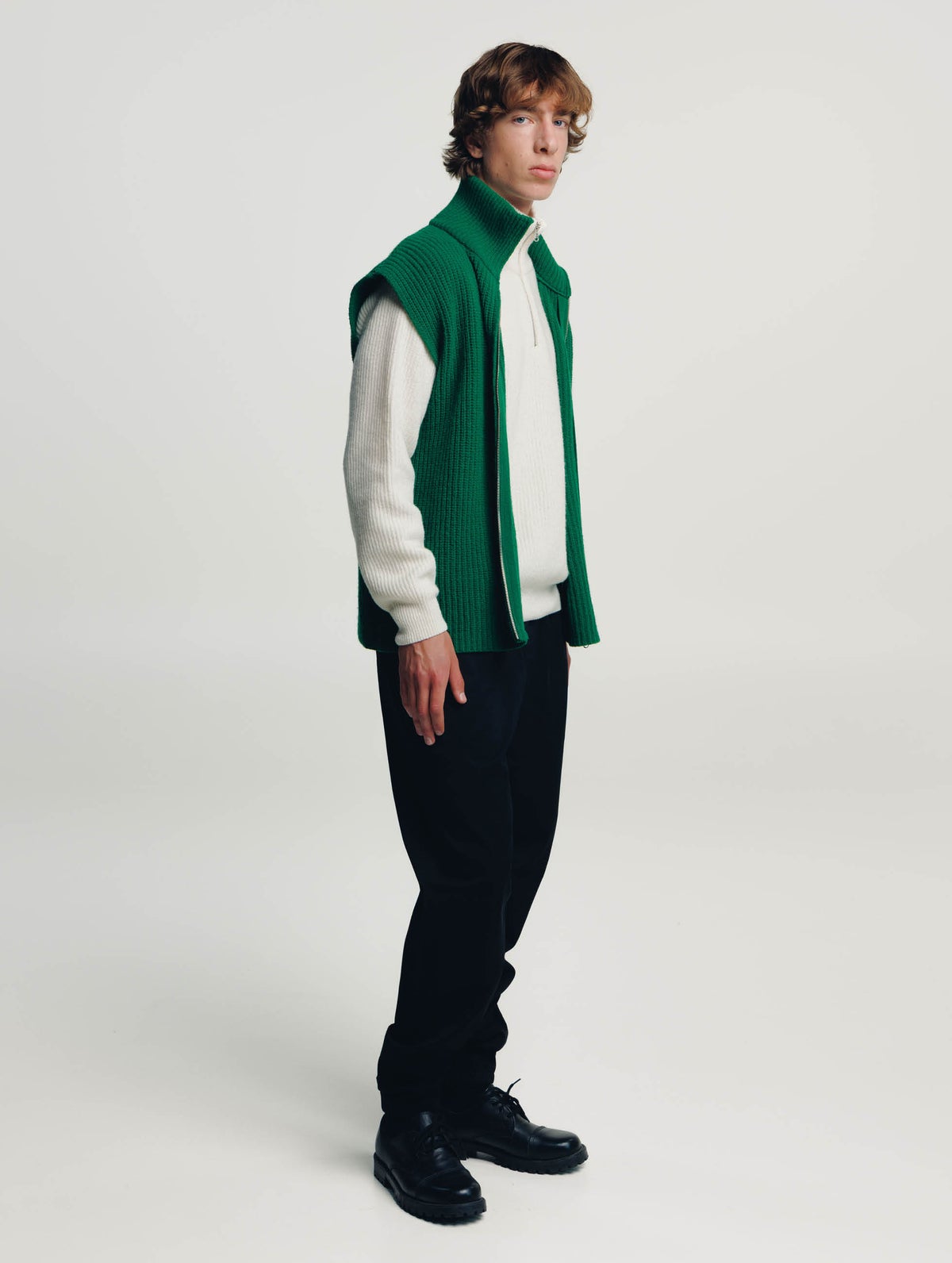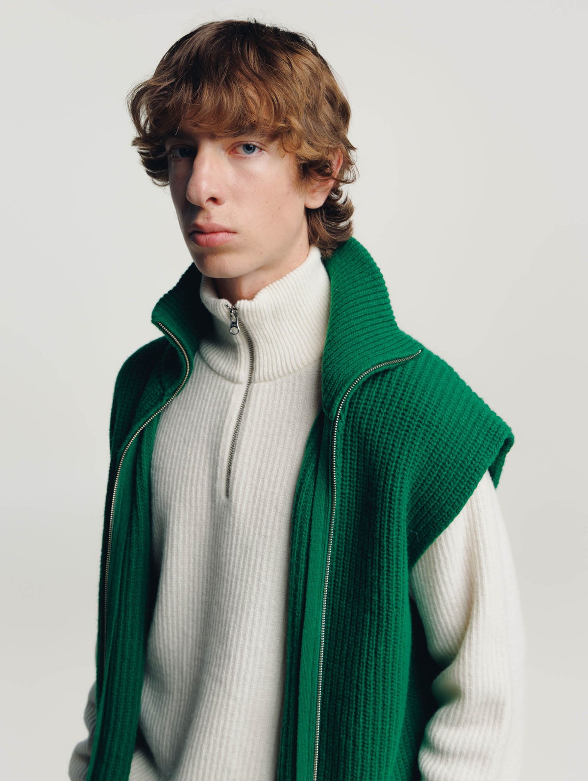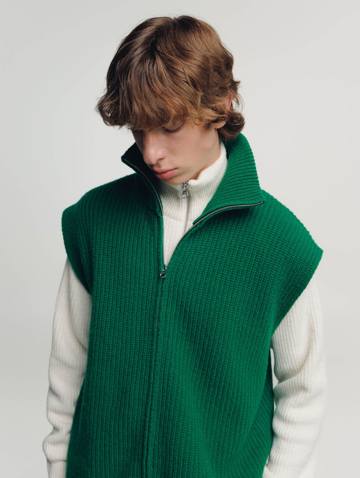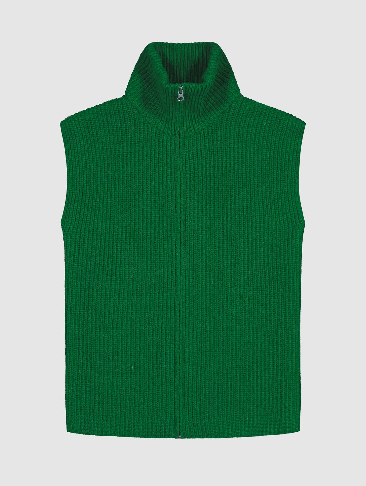 Unisex turtleneck knit vest. Zipper on the front.
