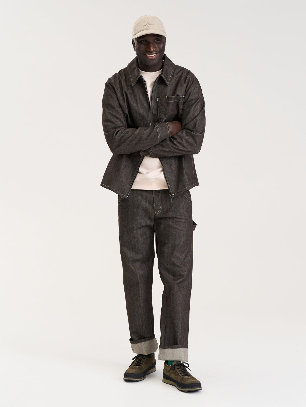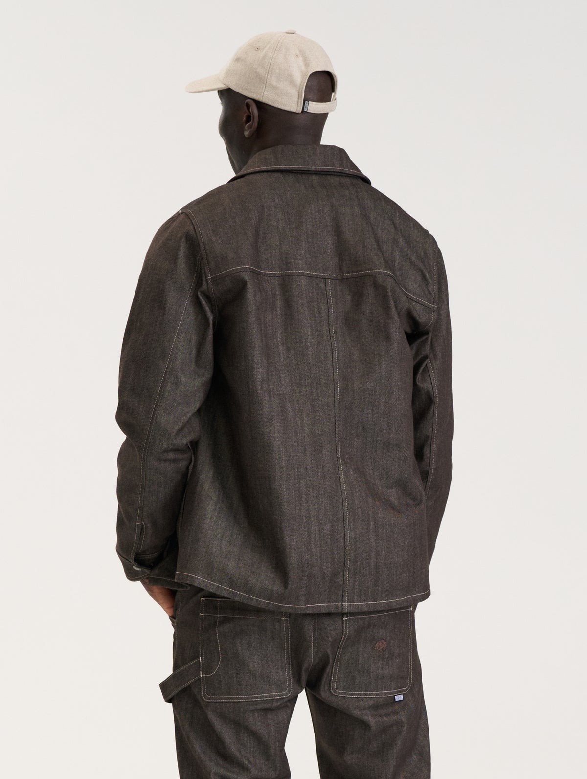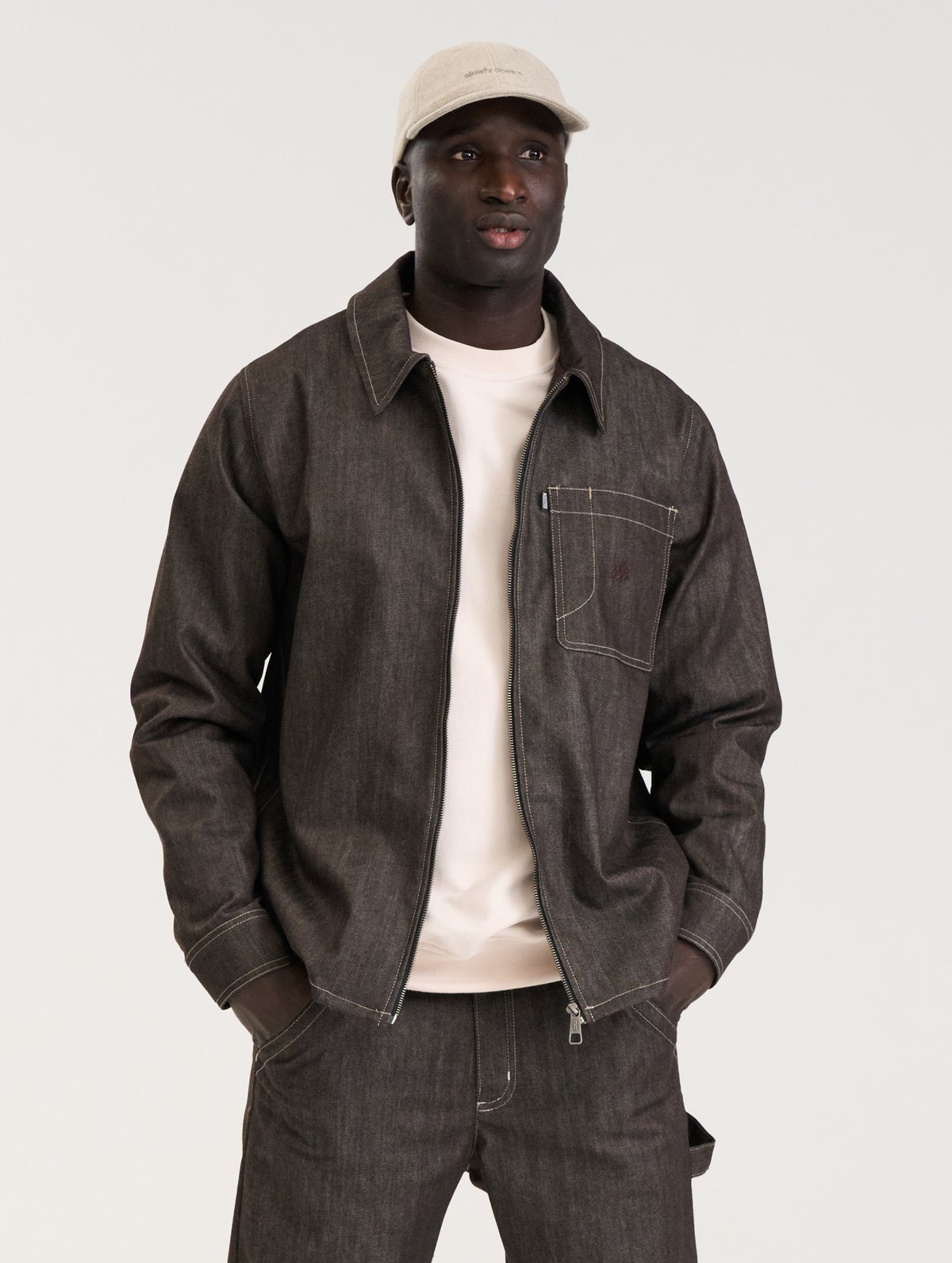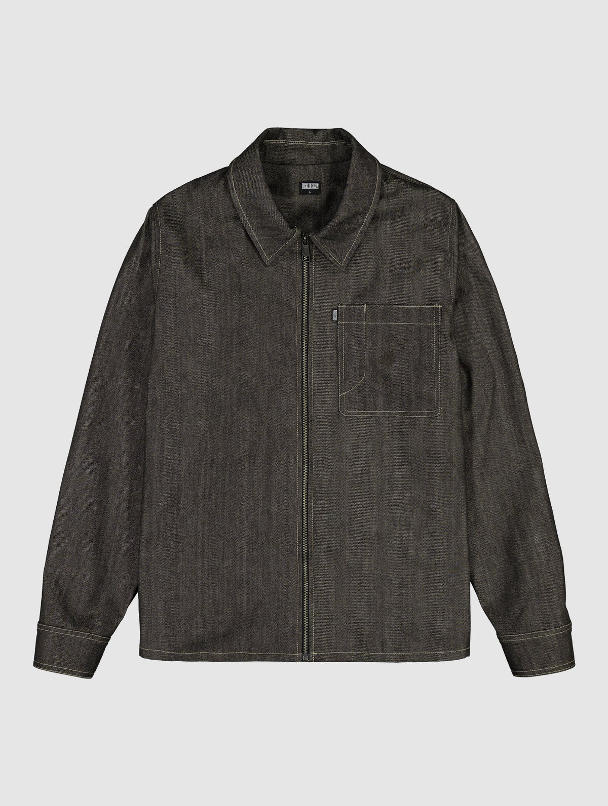 Men's denim jacket which has a zipper on the front, patch pocket on the chest and pockets on the side seams. The chest pocket has a tone-on-tone embroidery. Snap button adjustments and slits on the cuffs.