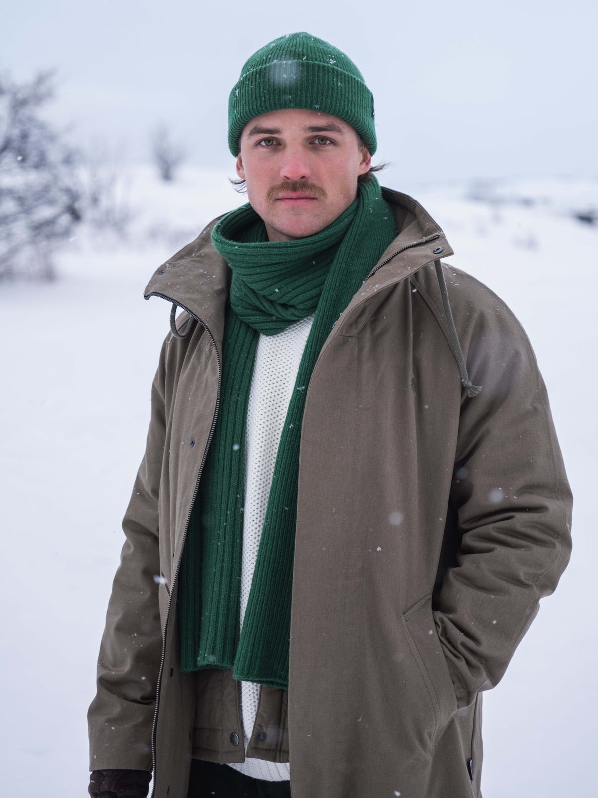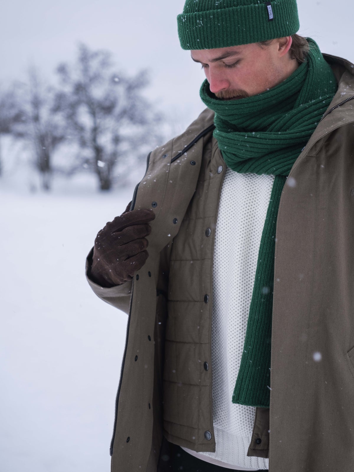 Men's midlength 3-in-1 jacket for between seasons and winter. Outer jacket has no lining and it's made of organic cotton. High collar with drawstring. Zipper on the front with wind panel and hidden snap buttons. Raglan sleeves and an embroidered tree logo on the front.