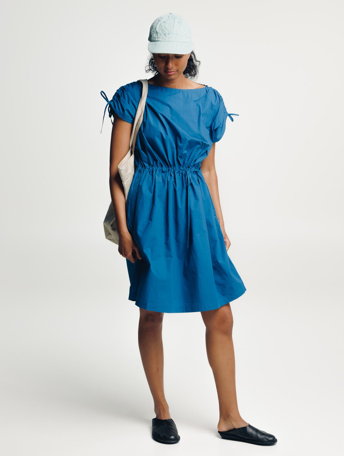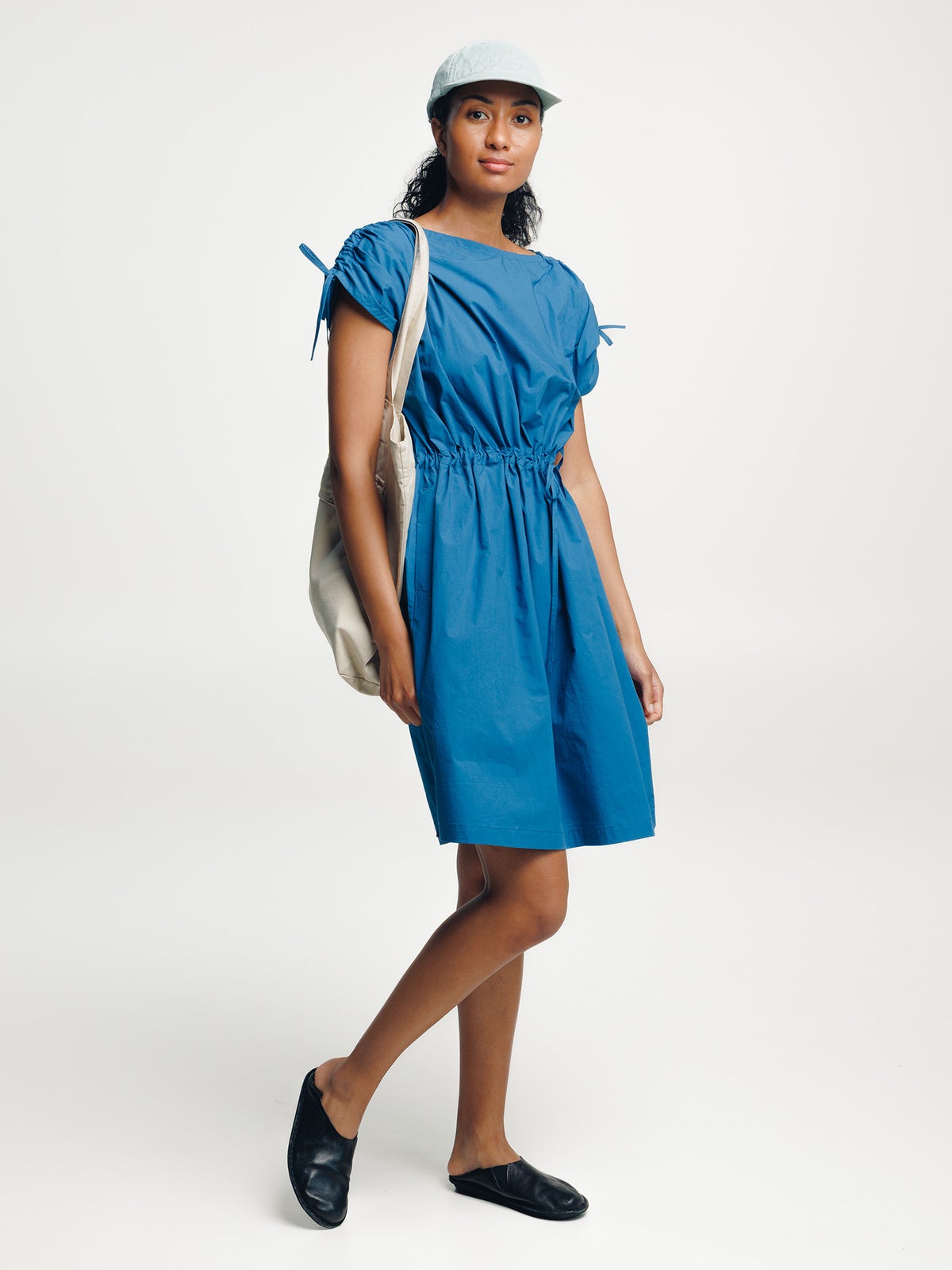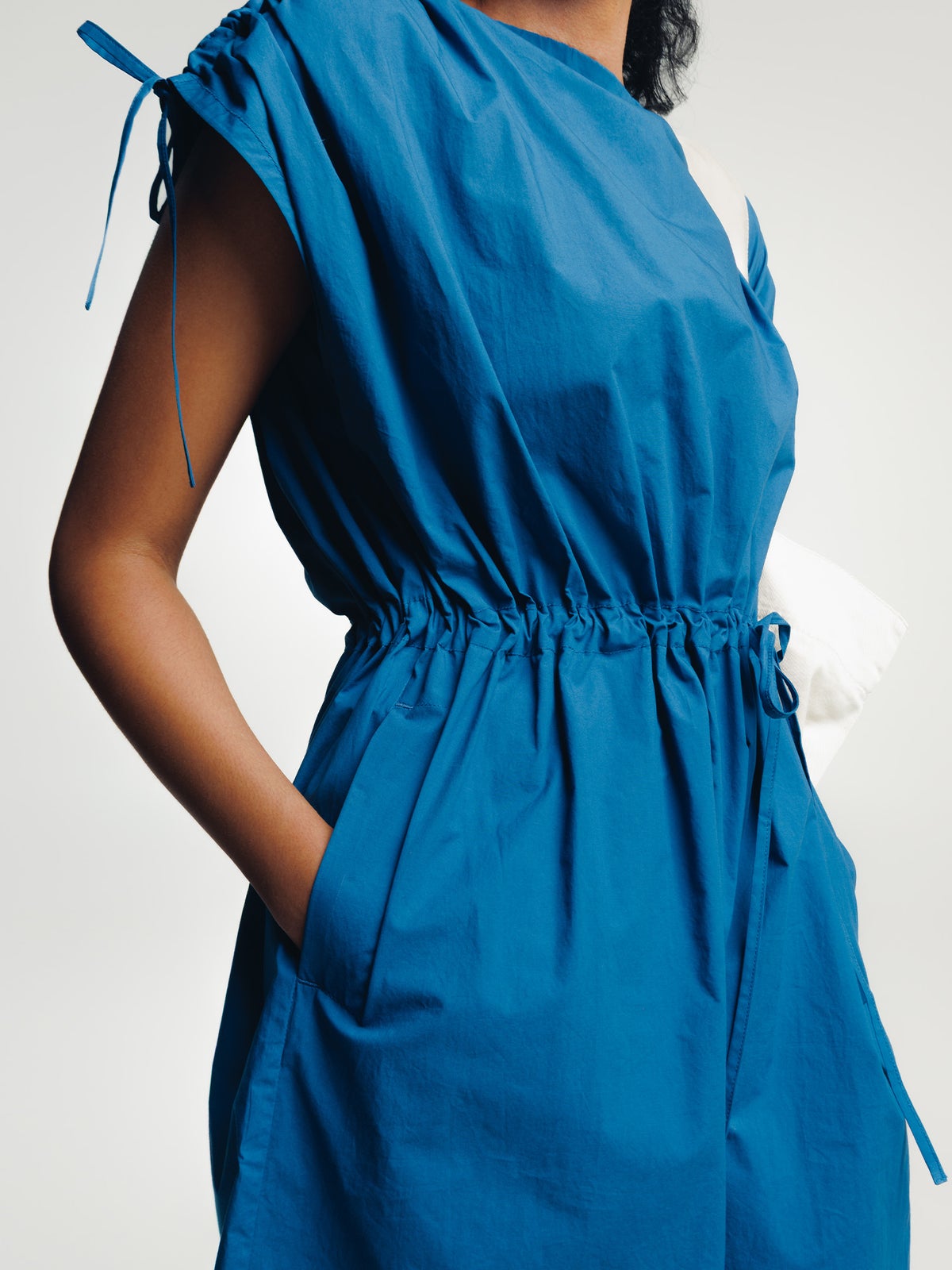 Light summer dress made of organic cotton. Adjustable neckline, shoulders and waist with drawstrings. Side seam pockets.