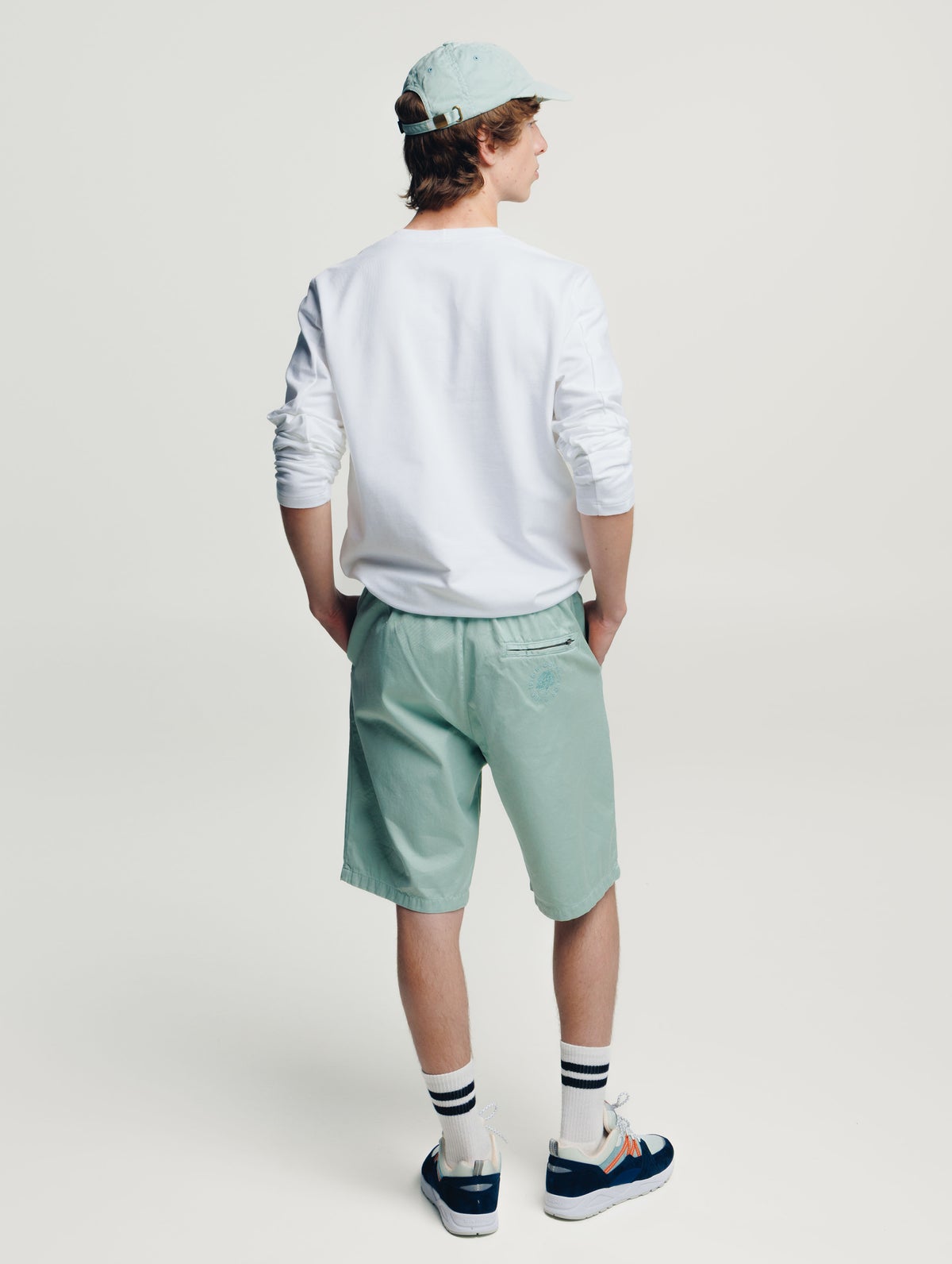 Anorak shorts. Elastic waistband with drawstring. Side pockets and a zippered back pocket with an embroidered logo on it. Unisex design.
