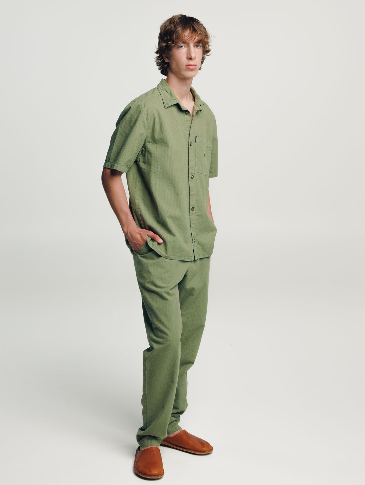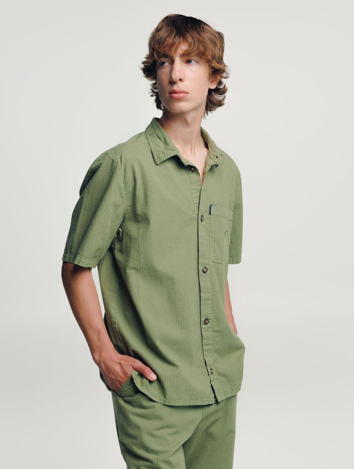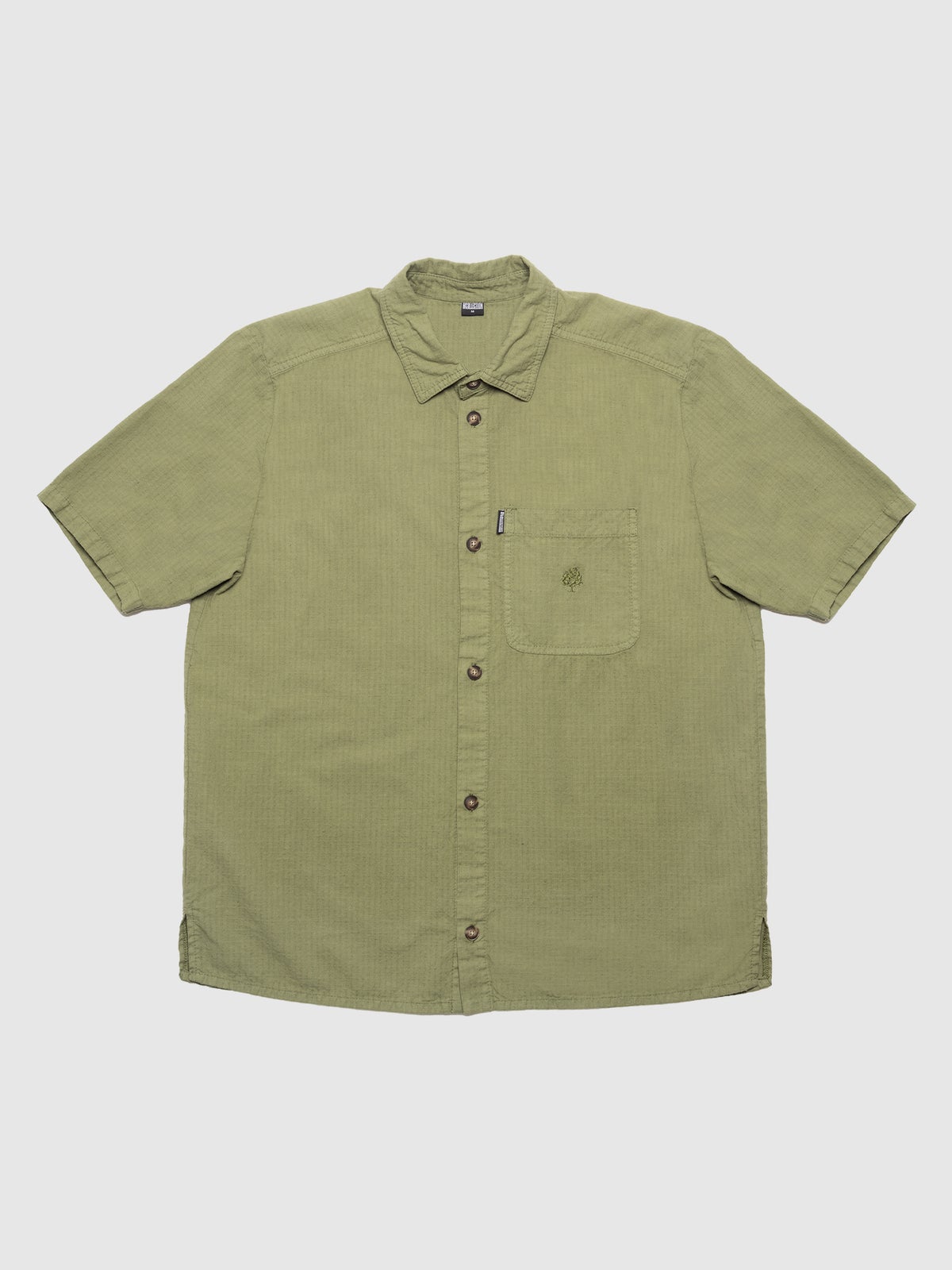 Men's short-sleeved shirt. Loose fit, collar, button closure, chest pocket with an embroidered tree, back yoke, and a slightly rounded hem.